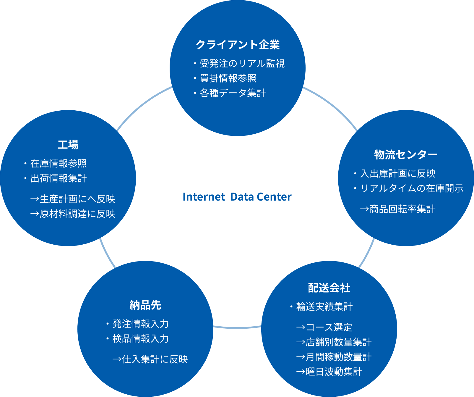 クライアント企業・工場・物流センター・配送会社・納品先等、業務に関係するサプライヤーが同一のデータを利用することにより、